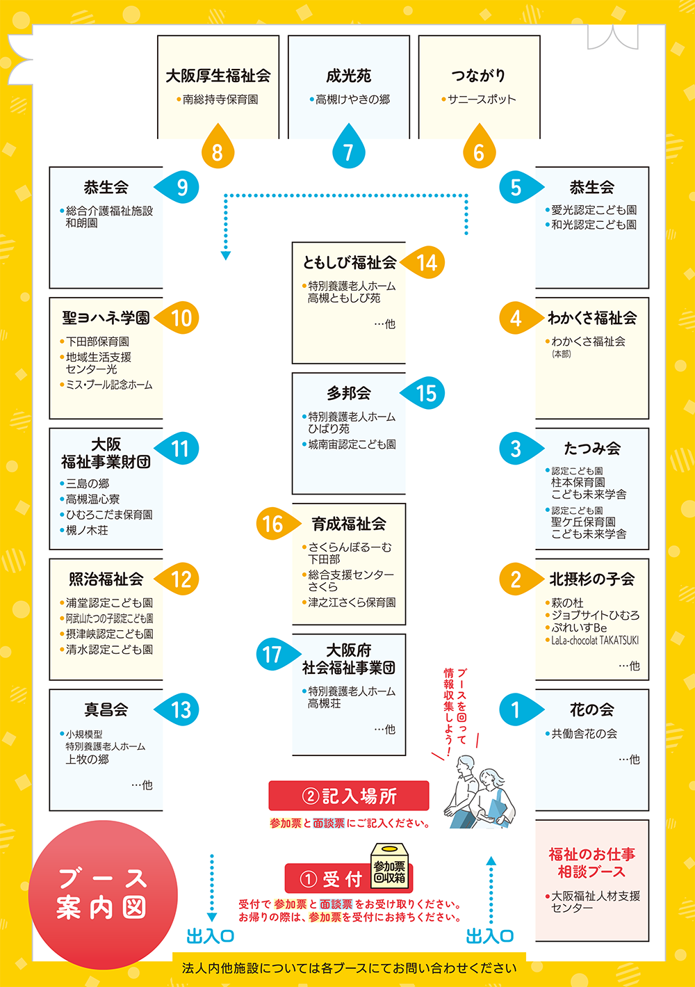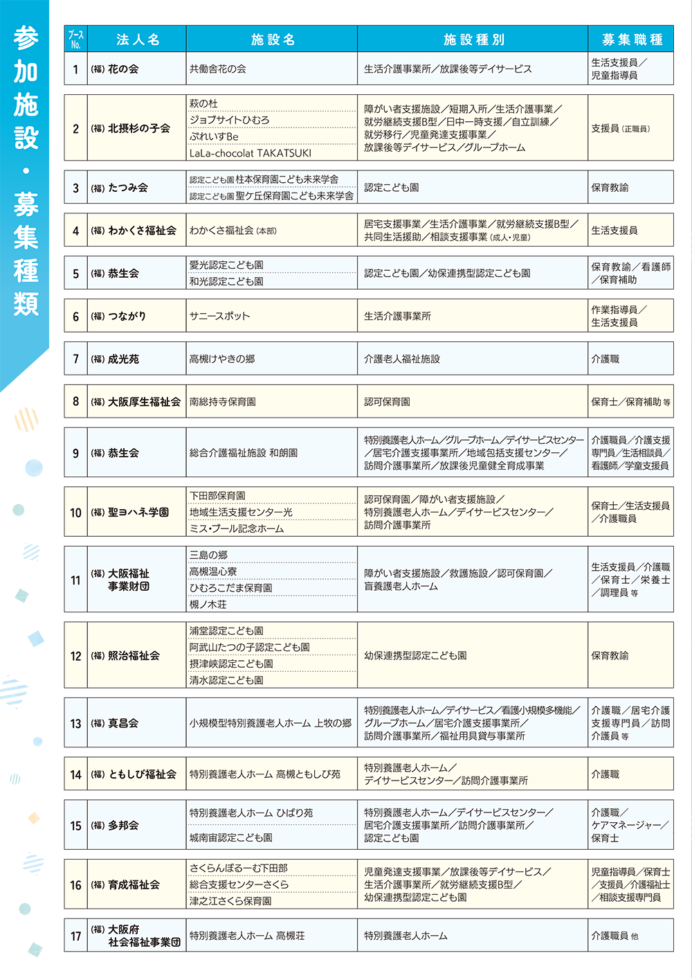 平成21年度より開催している、就職説明会です。高槻市民間社会福祉施設連絡会に所属している、保育・障がい・児童・高齢といった様々な分野の会員施設が参加しております。